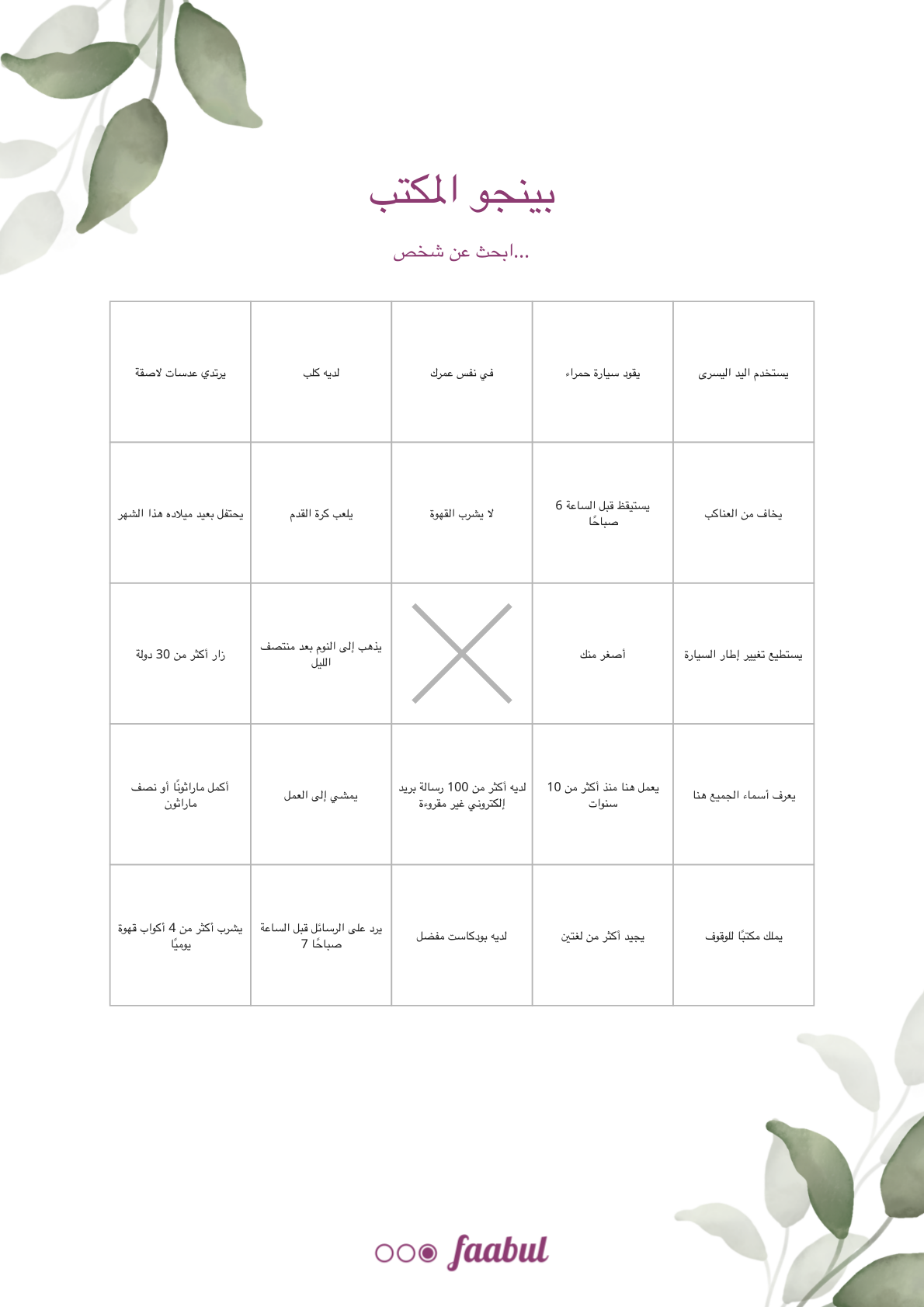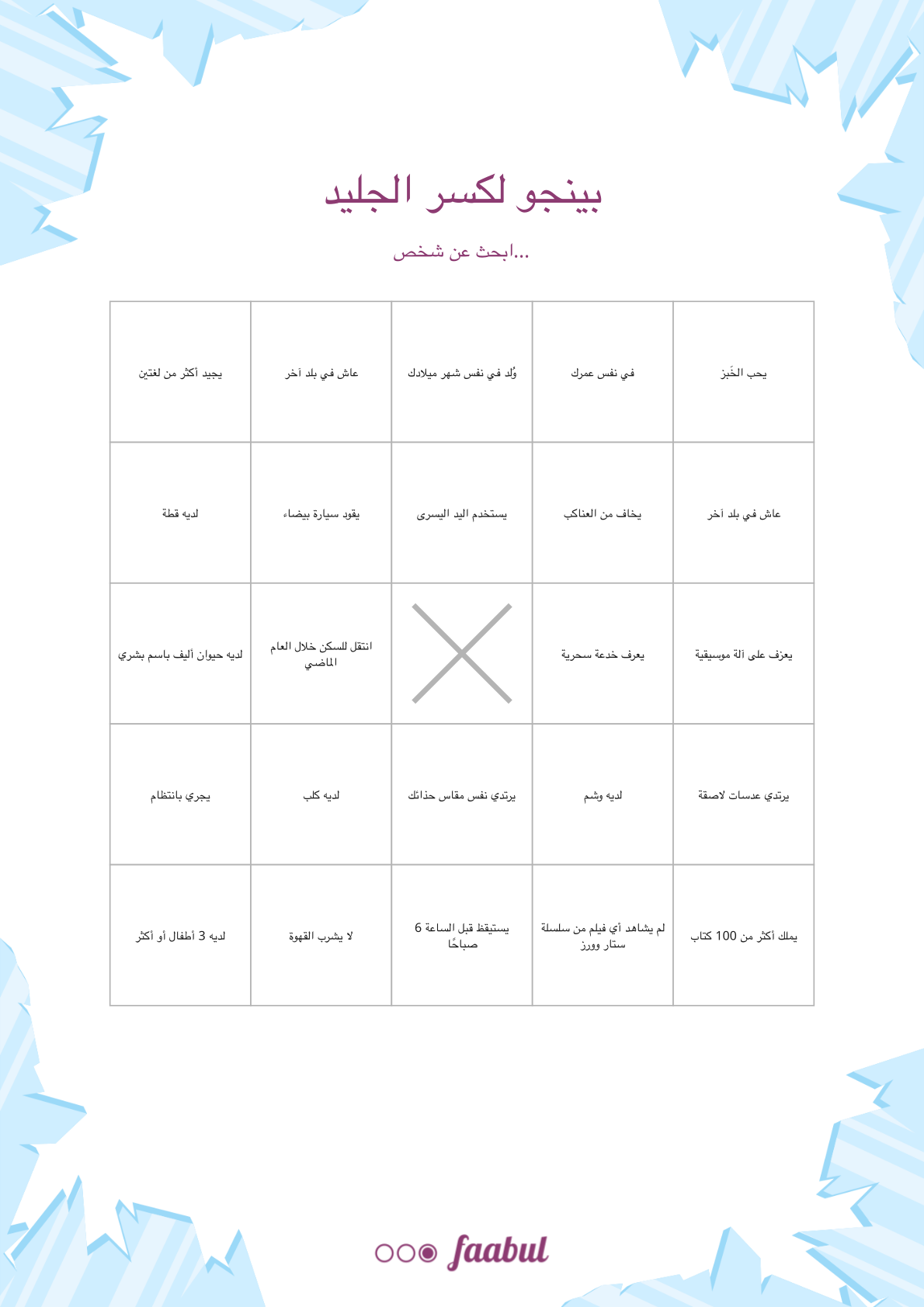 اطبع بطاقة لكل ضيف قبل الحدث. يتجول الضيوف ويبحثون عن أشخاص ينطبق عليهم كل مربع، ويكتبون أسمائهم في الخانات. أول من يكمل صفًا أو عمودًا أو قطرًا يفوز.