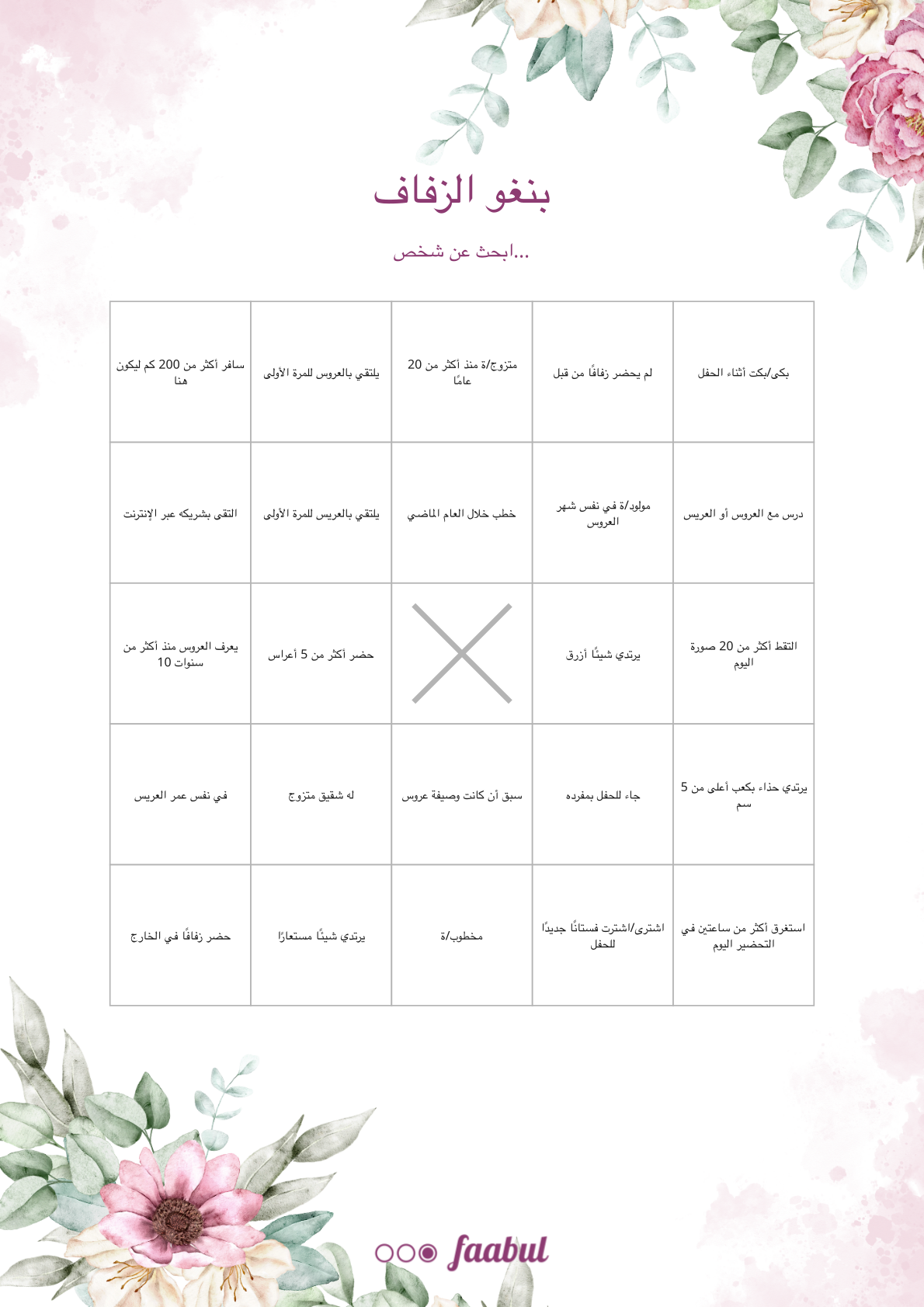 بطاقات بنغو زفاف قابلة للطباعة مجانًا تشجع الضيوف على التفاعل. ابحث عن أشخاص ينطبق عليهم كل مربع في بطاقتك. أكمل صفًا أو عمودًا أو قطرًا للفوز. حمّل بطاقة البنغو المجانية وأضف المرح إلى يوم زفافك.