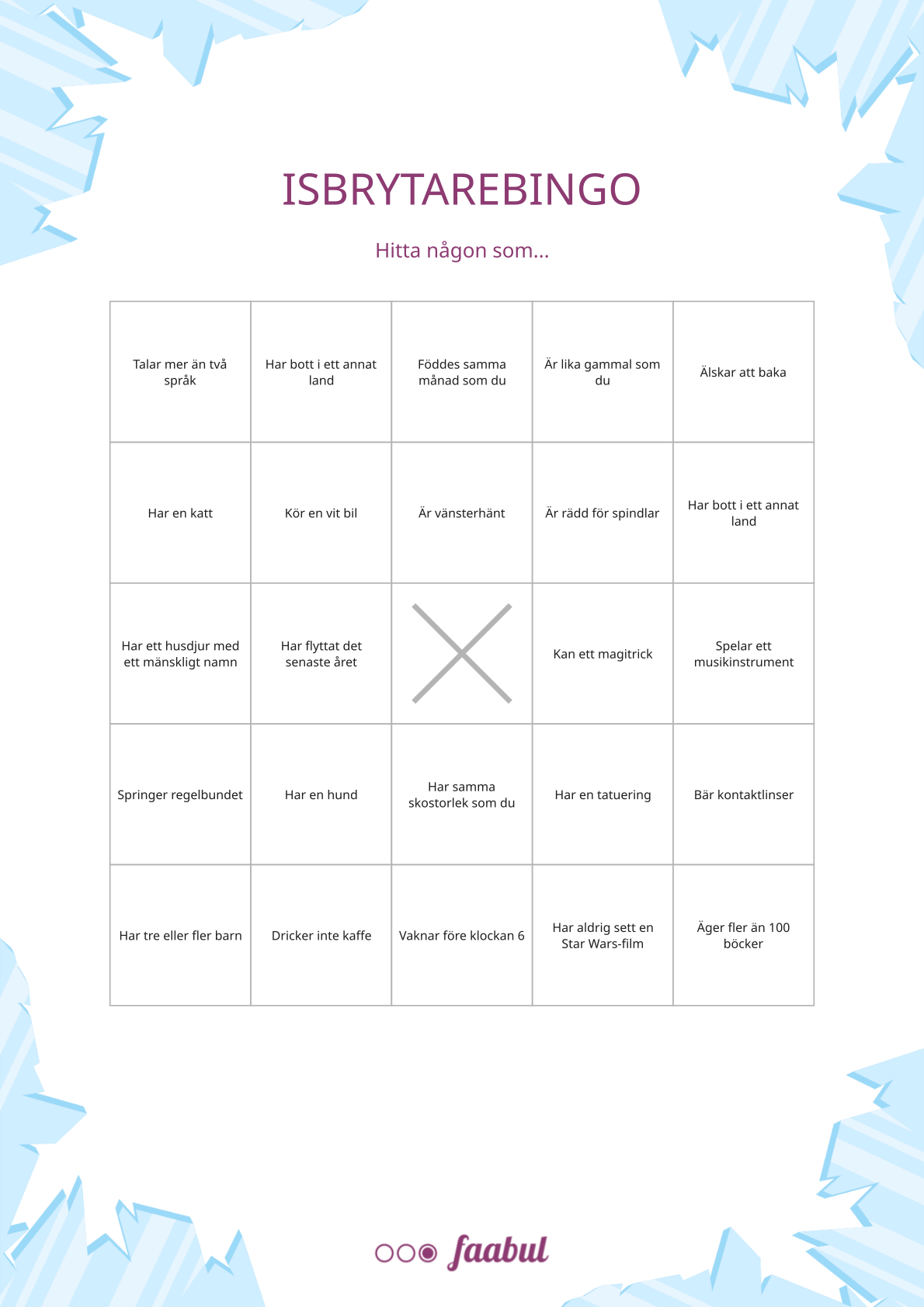 Skriv ut ett kort till varje deltagare. Alla minglar och hittar kollegor som matchar varje ruta och skriver deras namn i rutan. Den som först fyller en rad ropar BINGO.