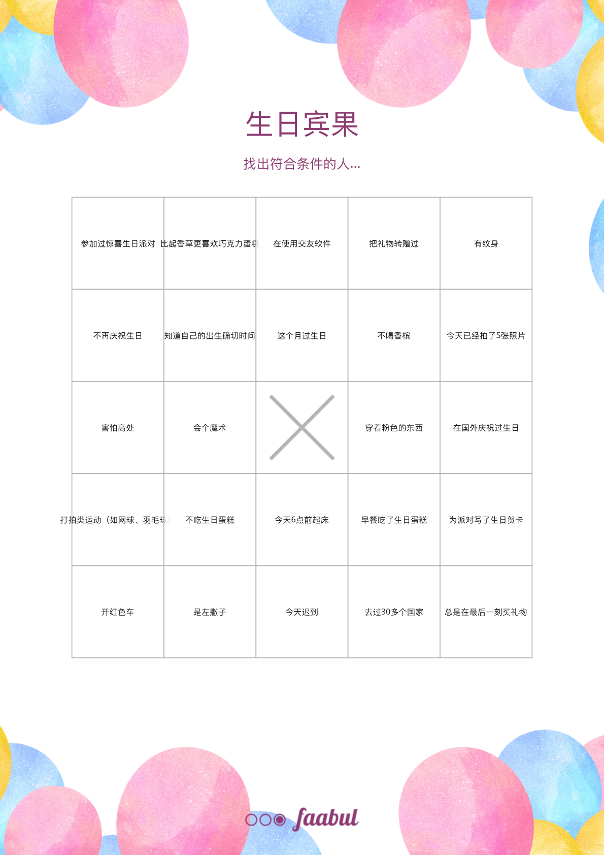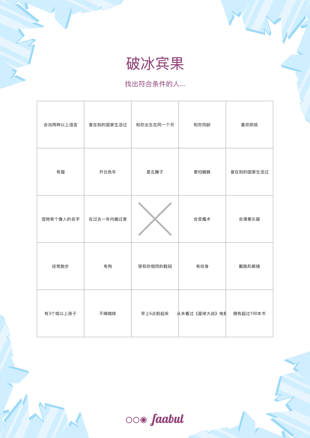 每位参与者打印一张卡片。大家互相交流,找出符合每个格子条件的同事,并在格子内写下姓名。第一个完成一行的人喊“BINGO”。